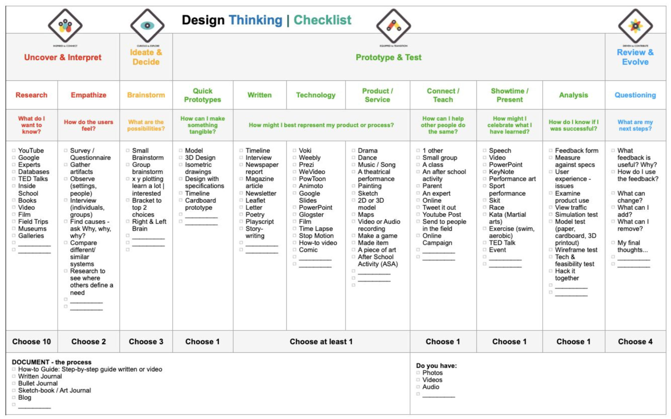 I have been modifying this Design Thinking Checklist for kids to scaffold them through an iterative process. My thinking is that educators would pick and choose a few sections to focus on for one product/process to explore with kids – the first time, highly guided.