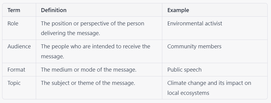 1. RAFT – This acronym stands for Role, Audience, Format, and Topic. RAFT prompts are often used in creative writing to help students imagine themselves in a particular role and write from that perspective.