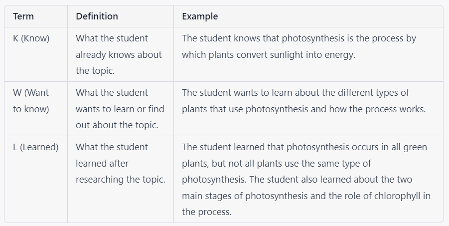 1. KWL – This acronym stands for Know, Want to Know, and Learned. KWL prompts are often used in research and inquiry-based learning to help students organize their thoughts and identify areas where they need more information.