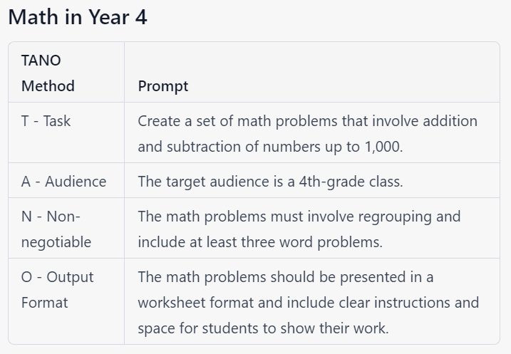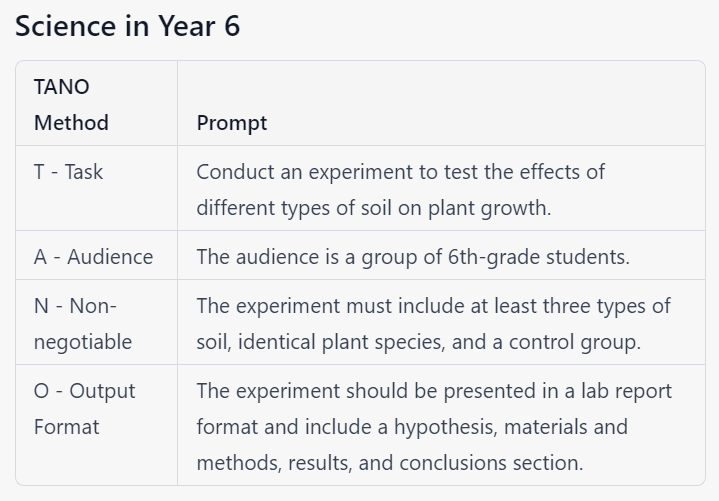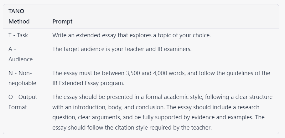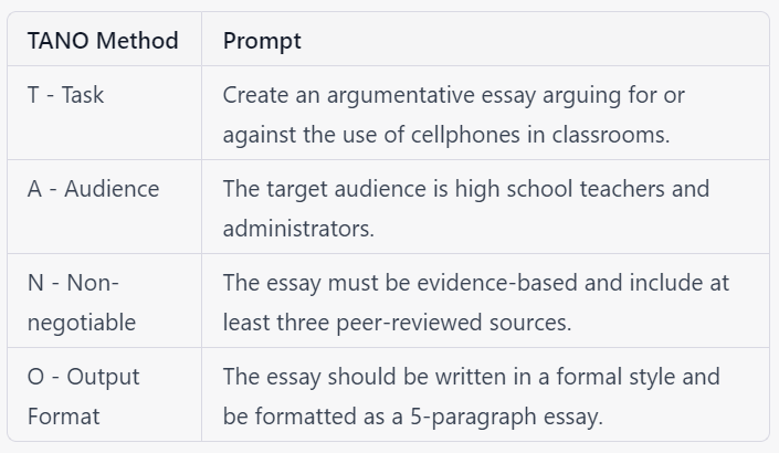 Some of the best and most specific prompts are those that provide clear context and ask specific questions. For example, a prompt like “Can you explain the process of photosynthesis in plants?” is somewhat clear with specific question that can be responded to with a thorough explanation. However, prompts for ChatGPT need to be even more specific. Try using TANO Prompts: