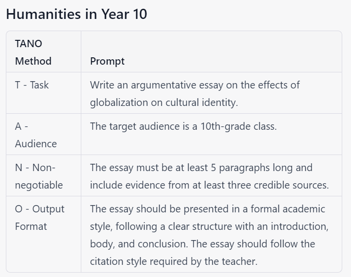 Example prompt: “Using the PASTA method, write a persuasive essay arguing for or against the use of standardized testing in schools.” – OR: